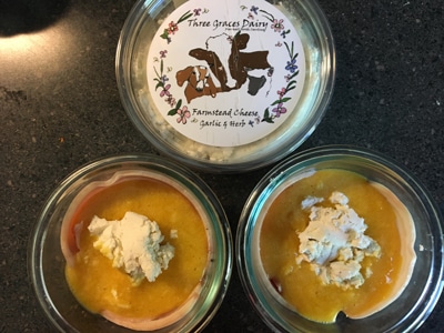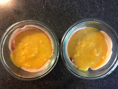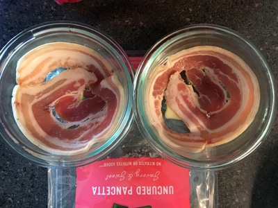Line greased ramekin’ with a slice of pancetta, pour in egg mixture, top with 1 tablespoon of goat cheese (garlic-herb is yummy), sprinkle with chives or parsley and bake for 15 minutes.