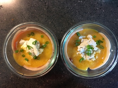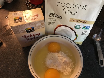Mix well, pour in to 2 greased ramekins’, bake at 400 degrees for 10-12 minutes. Cut in half and top with full fat cream cheese, ghee or butter. Makes 2 muffins.